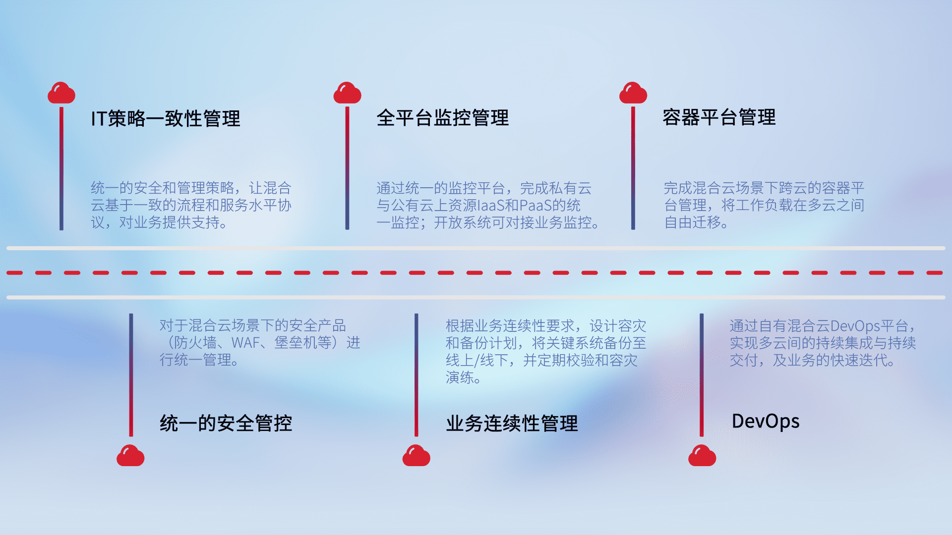 通过多云纳管,,以统一的资源数据模型把客户的云资源进行抽象和封装,,,进而实现对多云资源的统一操作,,保障云资源管理的可靠性、、稳定性与可用性。。量身定制化运维内容,,,,配置、、、开发运维、、、补丁管理、、、备份、、监控、、认证和访问管理、、、审计和日常巡检等,,保障在用云过程中的可靠度,,稳定度以及高可用率。。